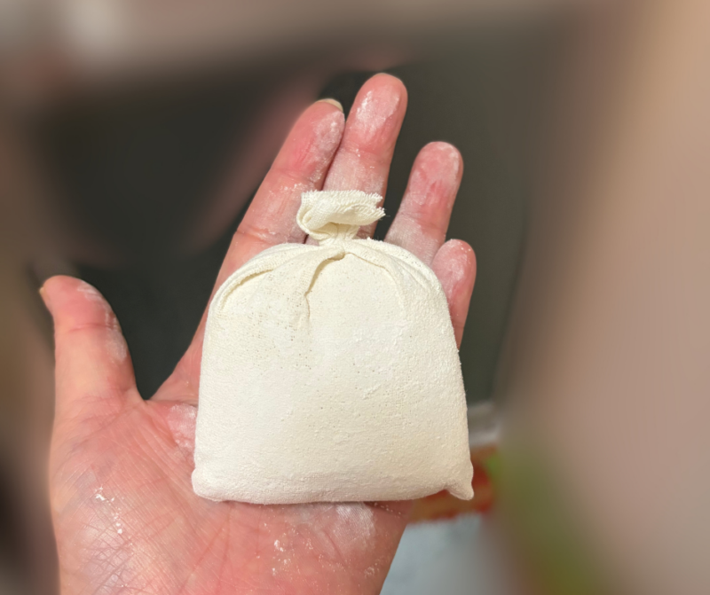ぬか袋は、水またはぬるま湯の中で軽くもみ、中までしっかり水分を含ませてから使います。